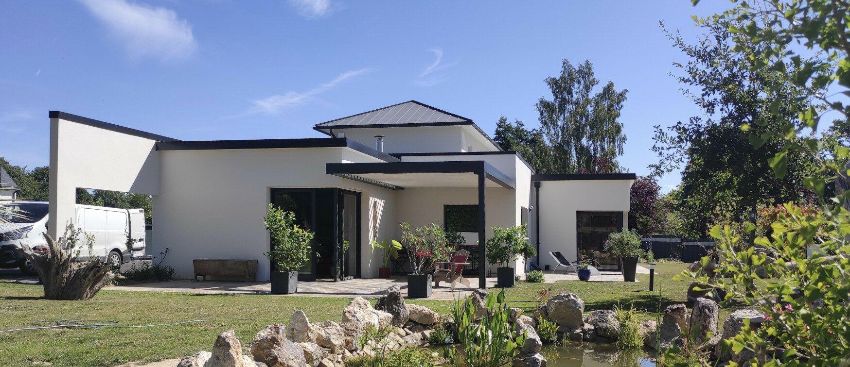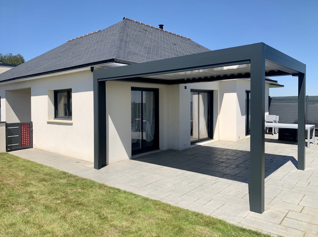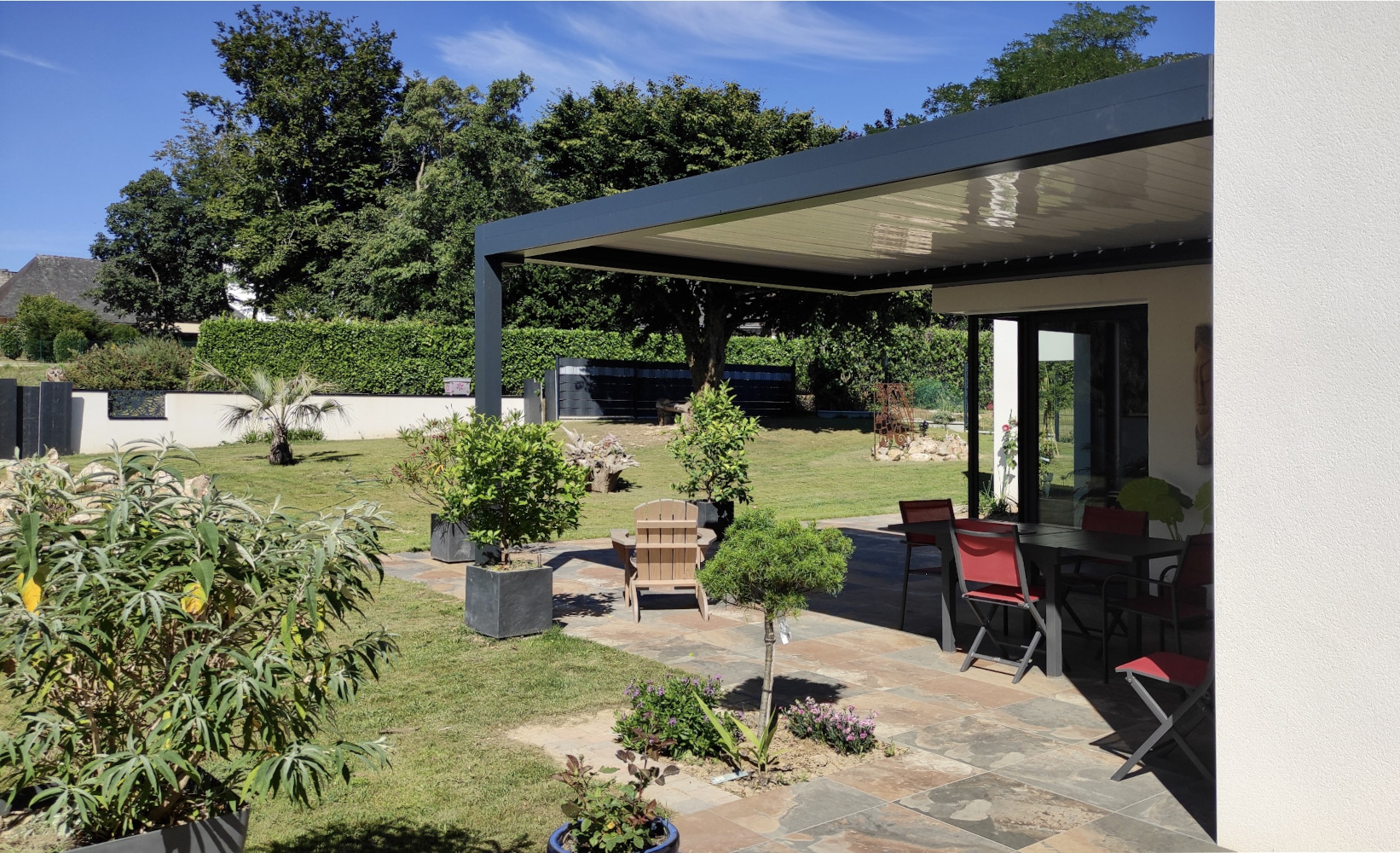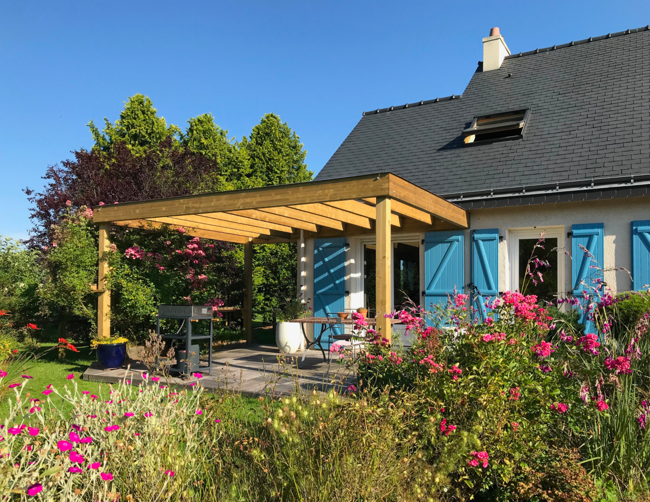 Pièce de lien entre la maison et l’extérieur, la pergola protège une partie du jardin des intempéries.
